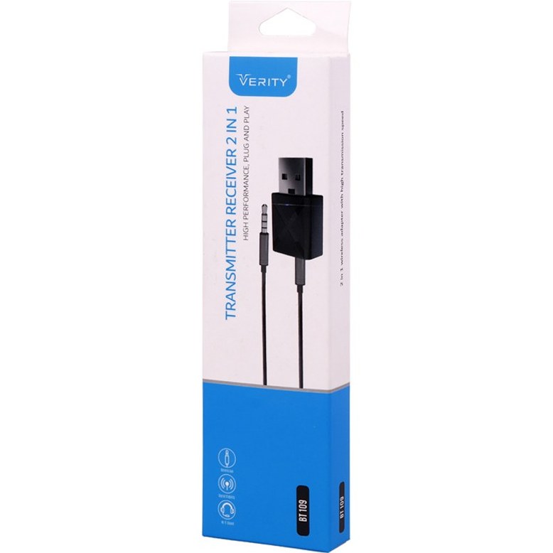 فرستنده و گیرنده بلوتوثی VERITY مدل BT109 بند انگشتی دارای قابلیت 2 کاره فرستنده و گیرنده صدا از طریق بلوتوث می باشد. به هنگامی که این دانگل به درگاه USB متصل می شود برق خود را از پورت USB تامین می کند. یک چراغ قرمز رنگ در حال چشمک زدن است که چراغ قرمز به نشان حالت فرستنده می باشد. در این حالت می توان از دستگاه هایی مثل موبایل ، MP3 پلیر ، رسیور ، تلوزیون ، دستگاه های پخش کننده صدا و … به اسپیکر و باندهای دارای بلوتوث متصل کرد.