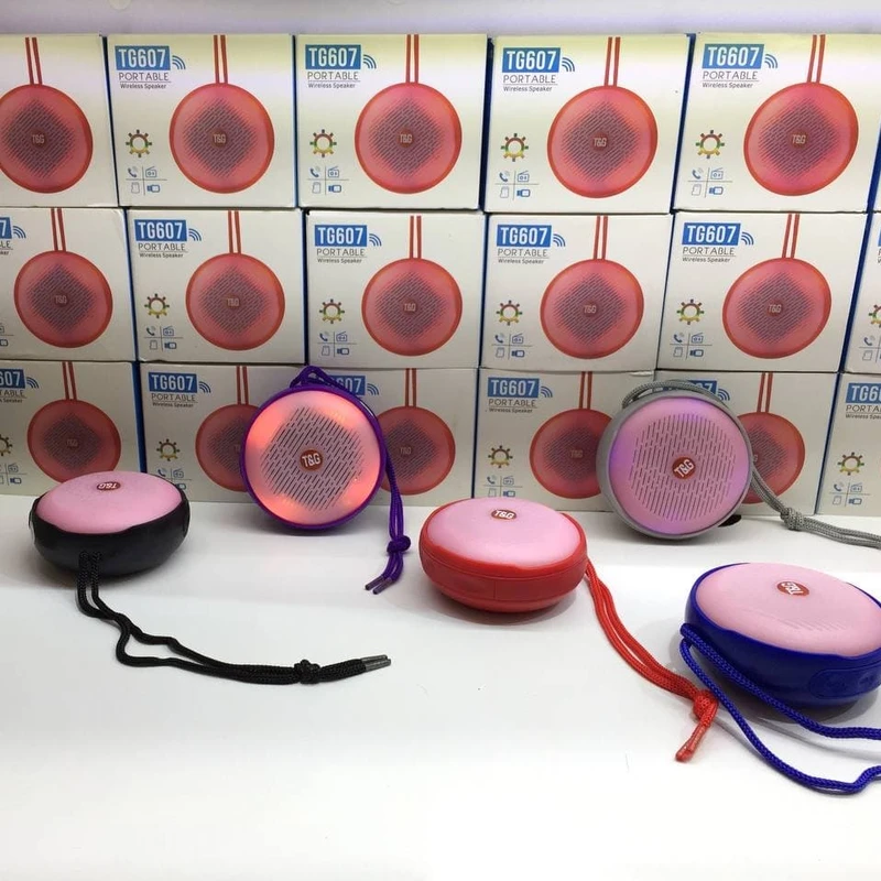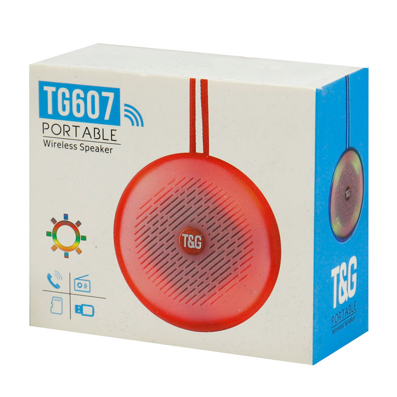 اسپیکر T&G مدل TG-607 دارای طراحی جالب و ابعاد بسیار کوچکی می باشد که قابلیت های مناسبی را به همراه دارد. این اسپیکر کوچک به راحتی در جیب یا کیف جای می گیرد و حمل آن با بند متصل شده، آسان تر هم شده است. اسپیکر تی اند جی TG607 به صورت بی سیم با نسخه بلوتوث ۴٫۲ می تواند به گجت های هوشمند دارای این قابلیت، متصل شود و تا فاصله برد ۱۰ متر بدون هیچ مشکل و قطعی به پخش موسیقی بپردازد. این اسپیکر همچنین توسط رابط جک صوتی ۳٫۵ میلی متری، پورت فلش مموری USB و درگاه کارت حافظه نیز امکان دسترسی به لیست آهنگ ها را فراهم می کند. اسپیکر TG607 در نگاه اول به خاطر وزن و ابعادش جلب توجه می کند، اما برخلاف ظاهر دارای صدایی رسا و قدرتمند می باشد که با توان خروجی ۳ وات و محدوده فرکانسی رنج داینامیکی ۱۸۰۰۰ هرتز، می تواند یک صدایی با وضوح فراگیر و بیس عالی به گوش برساند.باتری اسپیکر تی اند جی TG-607، ظرفیت ۴۰۰ میلی آمپر ساعتی دارد که برای پخش مداوم موسیقی حداکثر ۳ ساعت ماندگاری شارژ خواهد داشت.لامپی از نوع LED برای نورپردازی در این اسپیکر تعبیه شده که با رنگ های مختلف، گوش دادن به موسیقی را لذت بخش تر می کند.